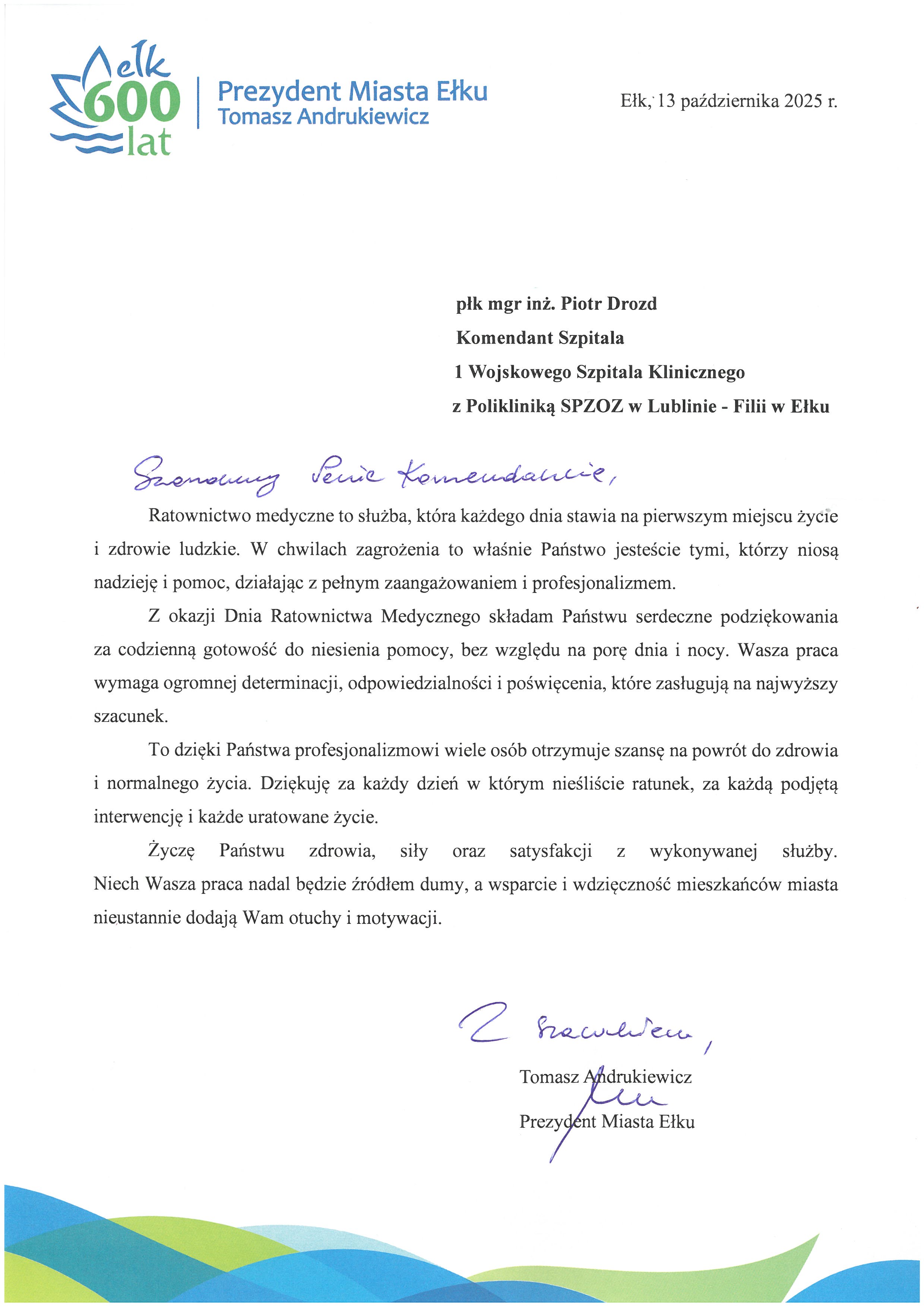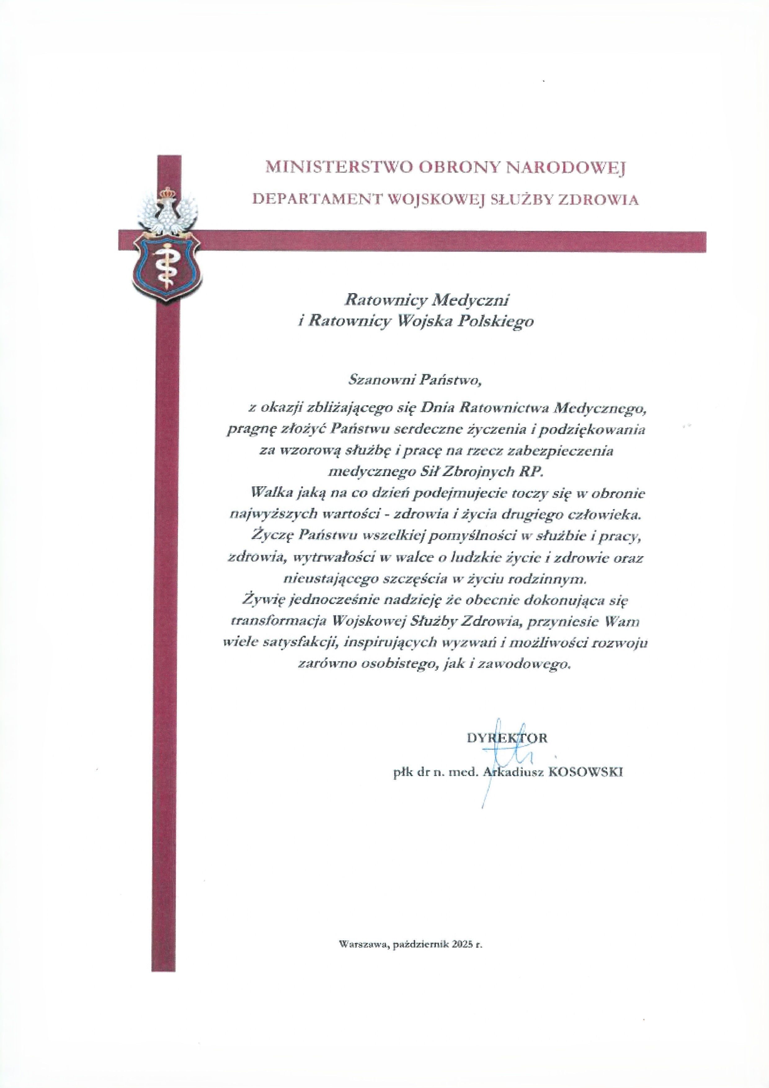 z okazji Waszego święta, razem z Dyrektorem Departamentu płk dr n. med. Arkadiuszem Kosowskim, życzymy Wam nieustającej pasji i motywacji do ratowania życia. Niech każdy dzień przynosi Wam poczucie spełnienia i dumy z tego, co robicie. Życzymy Wam zdrowia, siły i wytrwałości, abyście mogli nieść pomoc nawet w najtrudniejszych chwilach.